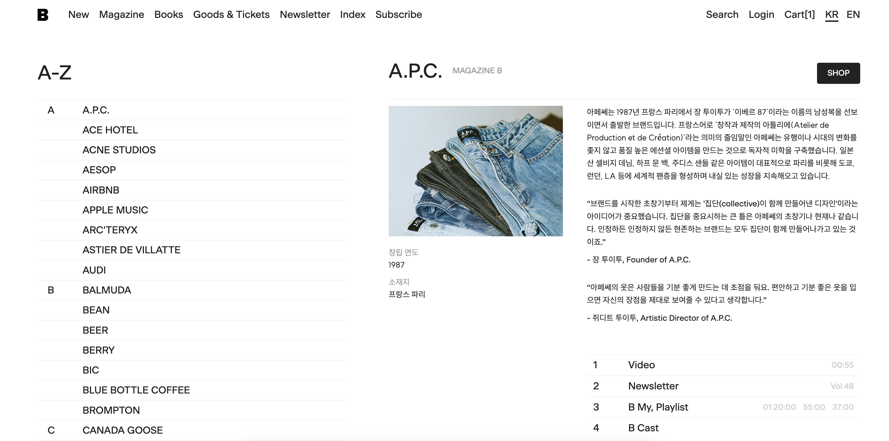 사이트에서 <B>의 각 이슈의 상세페이지-실물 이슈의 주요 페이지를 펼쳐서 단정하게 촬영한 몇 컷과 함께 2개의 주요 인용구만 발췌해둔 텍스트만 나타나 있는-들을 보면 위에서 언급한 이 분들의 DNA를 엿볼 수 있습니다. 그러니까 이 상세페이지 자체에서는 '어 맞아, 이번에 B가 또 B 했어.' 정도로 최소한의 설명만 해주고, 진짜 경험은 손에 들고 책장을 직접 넘기면서 해보기를 권하고 있는 것입니다. 온라인에서 최대한 유저를 오래 붙잡아두고 볼 거리를 계속 떠먹여주는 최근 웹 매거진 트렌드와는 아주 다른 커뮤니케이션 방식입니다.