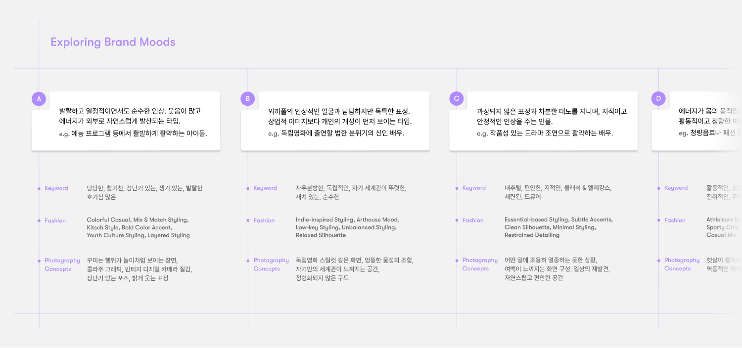 위와 같은 설계 논리를 바탕으로, 모델과 사진 콘셉트를 중심으로 한 무드보드 4안을 구성했습니다. 무드보드는 모델의 외형과 태도, 화보의 분위기, 패션과 라이프스타일 이미지를 포함해 브랜드 캠페인과 비주얼 커뮤니케이션 전반에 영향을 미칠 인물상을 제안하는 역할을 했습니다. 이는 블랑디바가 어떤 얼굴을 가진 브랜드인지, 그리고 블랑디바를 소비하는 사람들이 어떤 이미지를 선망하는지를 구체적으로 상상할 수 있도록 하기 위한 장치였습니다.